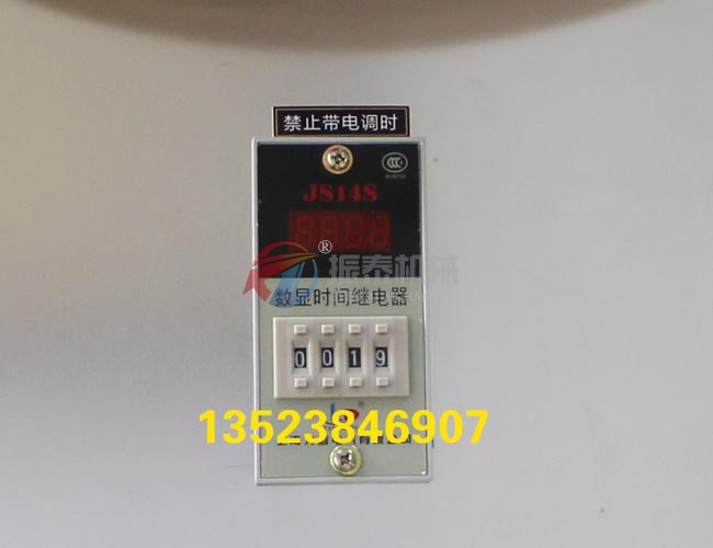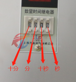 試驗篩的時間繼電器一共有6組可調節的按鈕,從右往左數,右邊的兩組是指的秒數,左邊的兩組指的是分鐘。例如設定為0300的話代表的是3分鐘。而不是300秒。下圖的時間應為19秒。0119的話應是1分鐘19秒。而不是119秒。